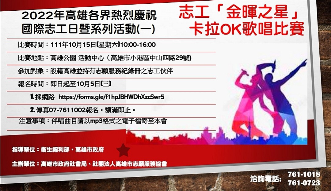 (三)參加對象:設籍高雄並持有志願服務紀錄冊之志工伙伴(為維護大家健康安全,參賽者需施打2劑以上新冠疫苗,報名時請檢
