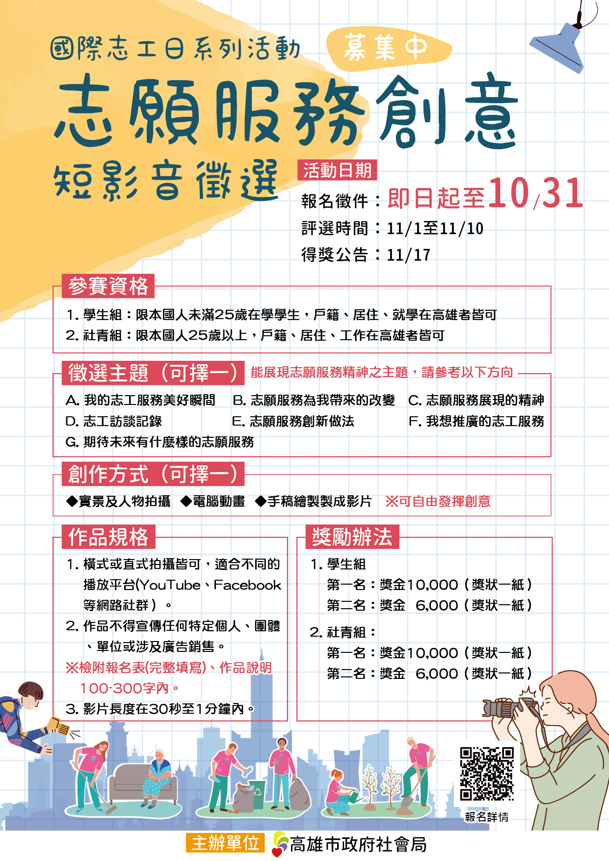 為提升市民對志願服務的認識與參與度,並鼓勵更多民眾加入志工行列,特舉辦「國際志工日系列活動-志願服務創意短影音徵選」活動。