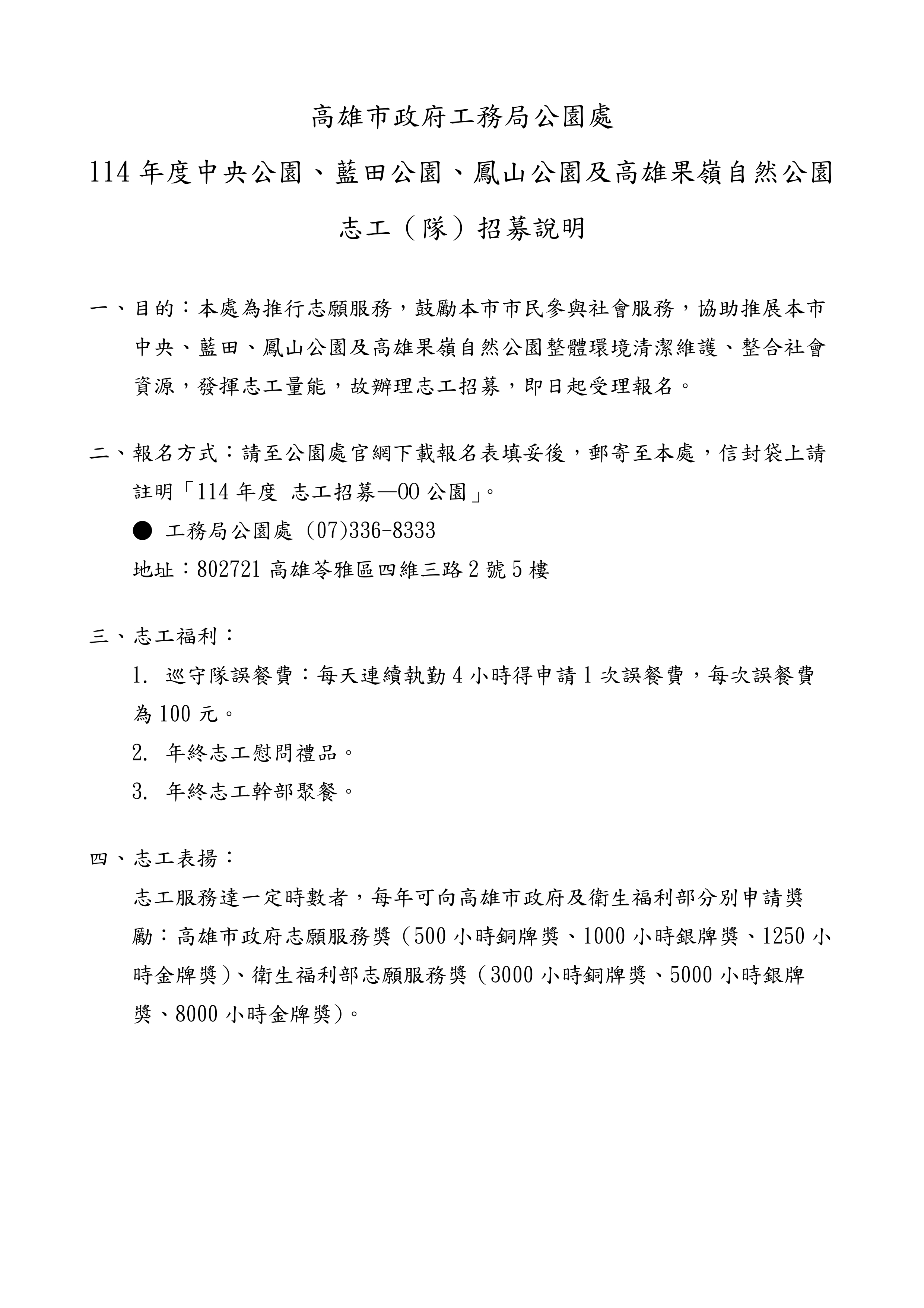 現在位置: 首頁 / 公告專區-中心訊息 / 高雄市政府工務局公園處-114年志工招募-中央公園、藍田公園、鳳山公園及高雄果嶺自然公園
