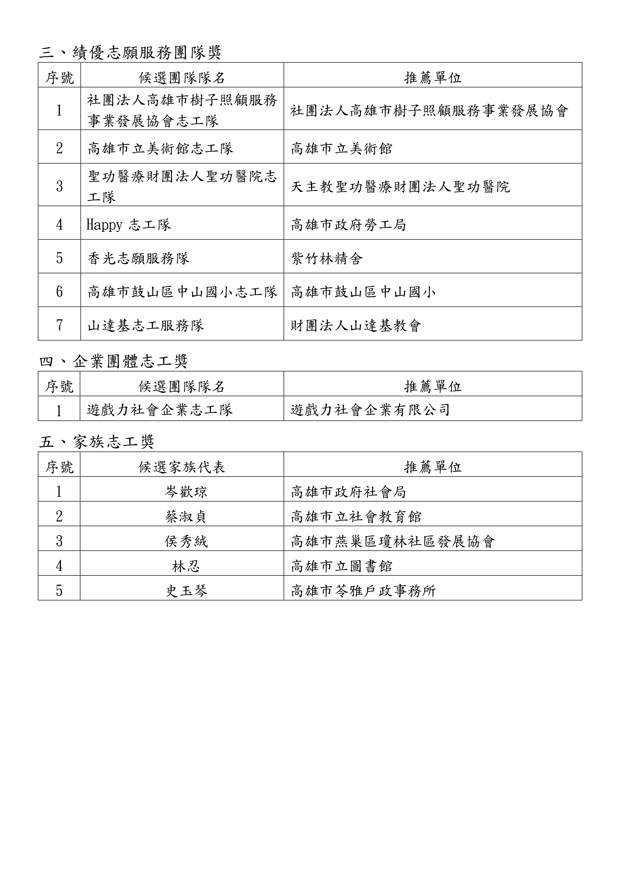114年度本市志願服務獎勵─第21屆金暉獎選拔-獲獎名單