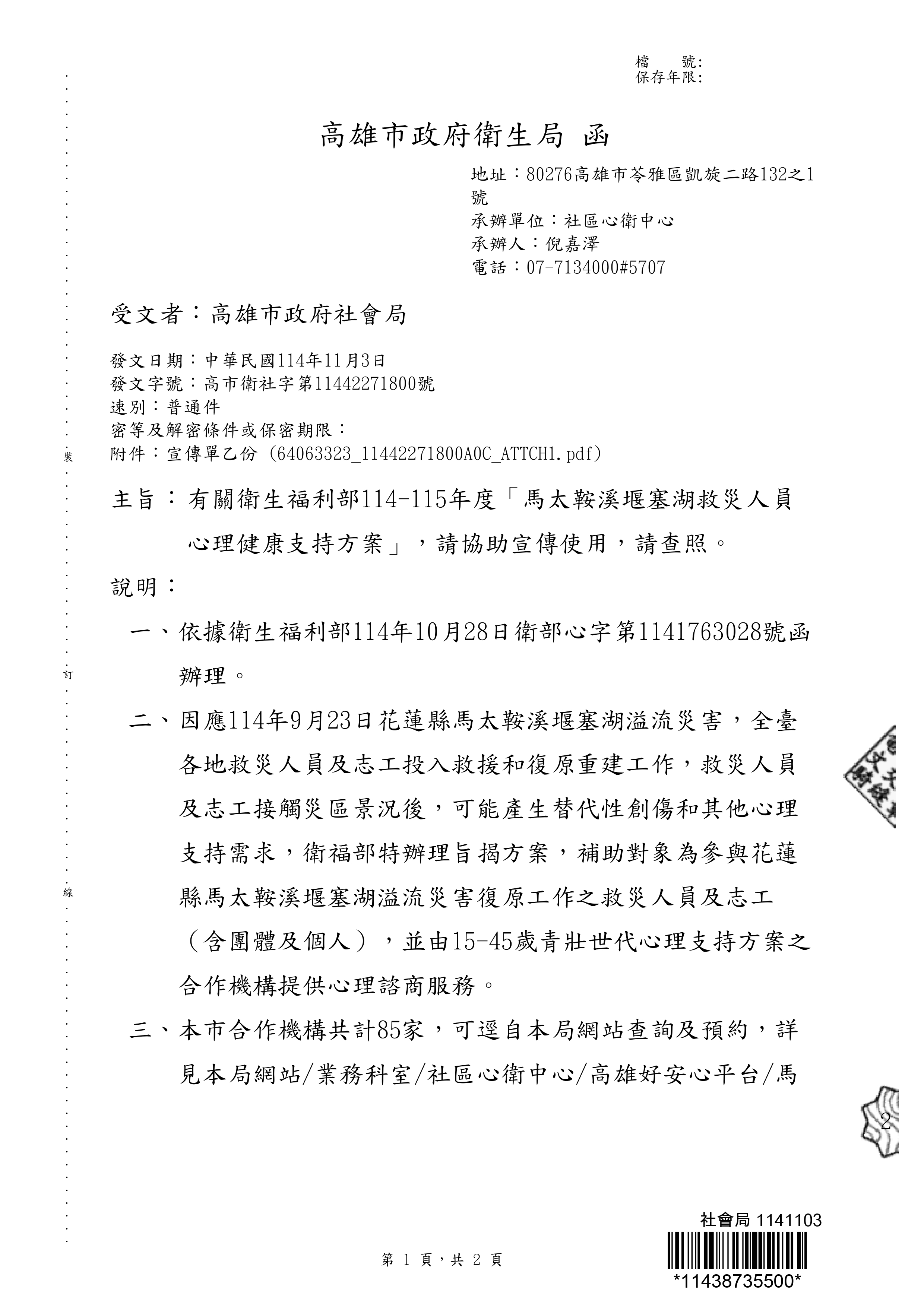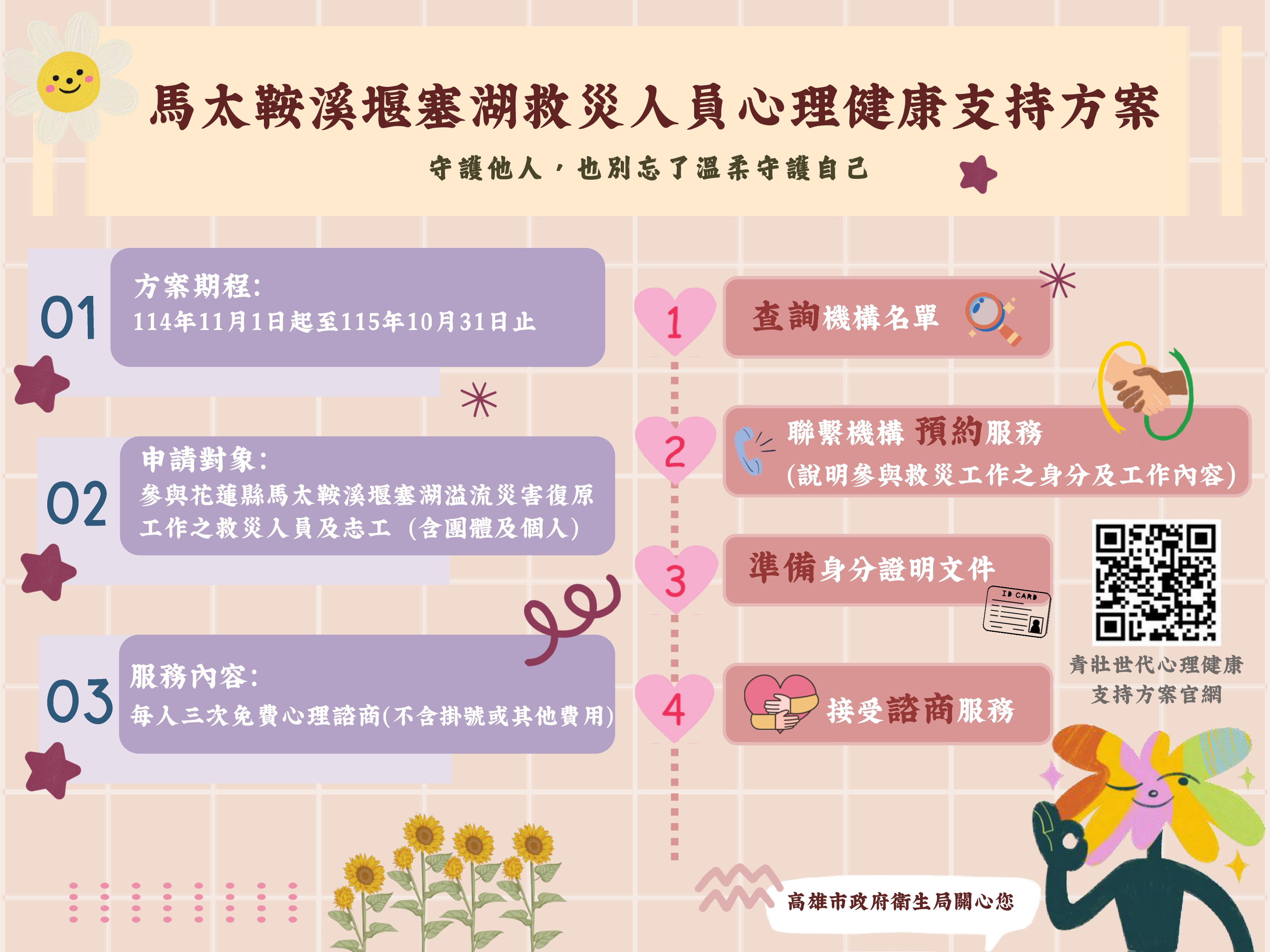 為因應114年9月23日花蓮縣馬太鞍溪堰塞湖溢流災害,全臺各地救災人員及志工投入救援和復原重建工作,救災人員及志工接觸災區景況後,可能產生替代性創傷和其他心理支持需求,衛福部特辦理前揭方案,補助對象為參與花蓮縣馬太鞍溪堰塞湖溢流災害復原工作之救災人員及志工(含團體及個人),並由15-45歲青壯世代心理支持方案之合作機構提供心理諮商服務,本市合作機構計85家,可至衛生局網站查詢及預約。