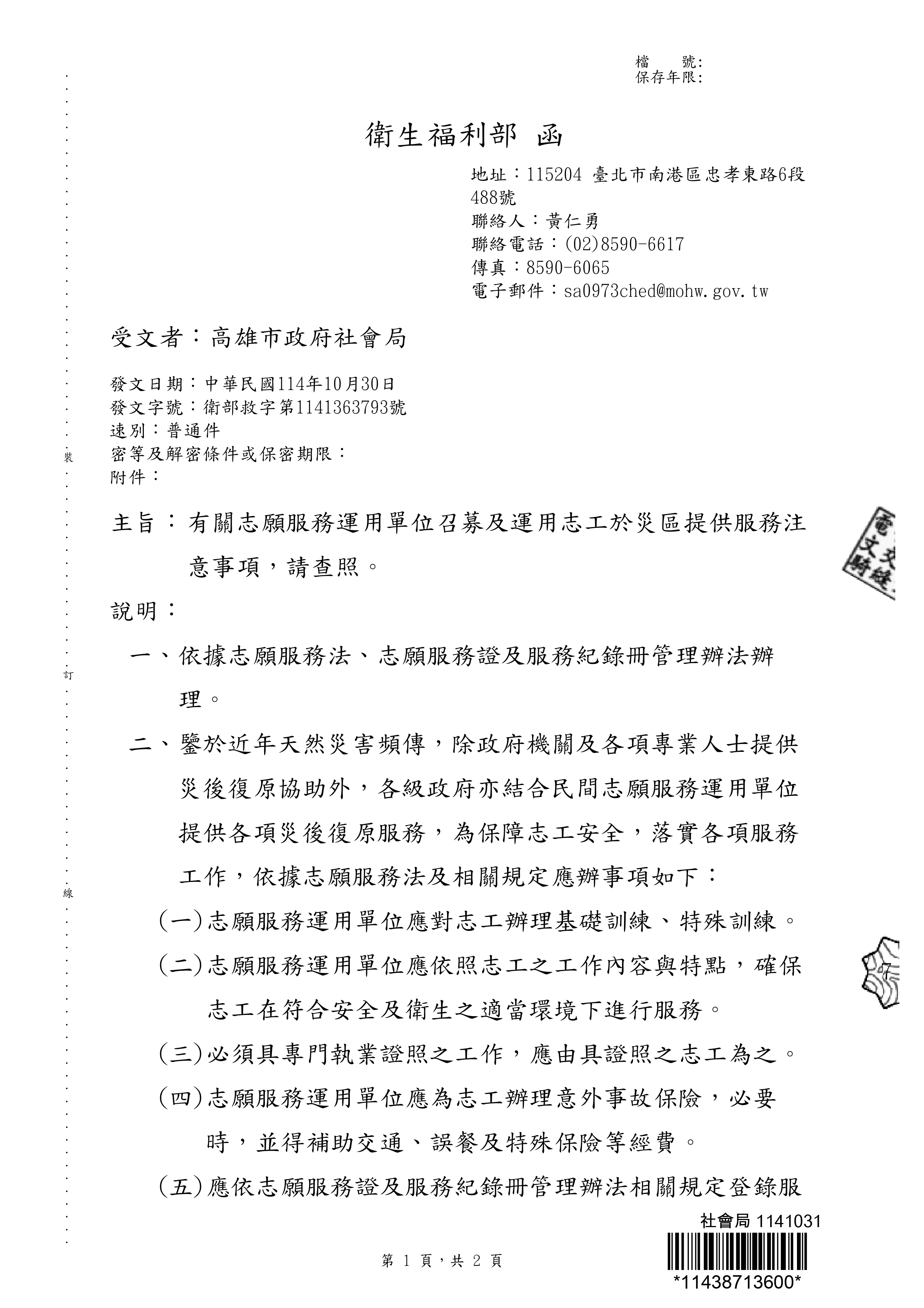 現在位置: 首頁 / 公告專區-中心訊息 / 轉知衛生福利部有關志願服務運用單位召募及運用志工於災區提供服務注意事項~