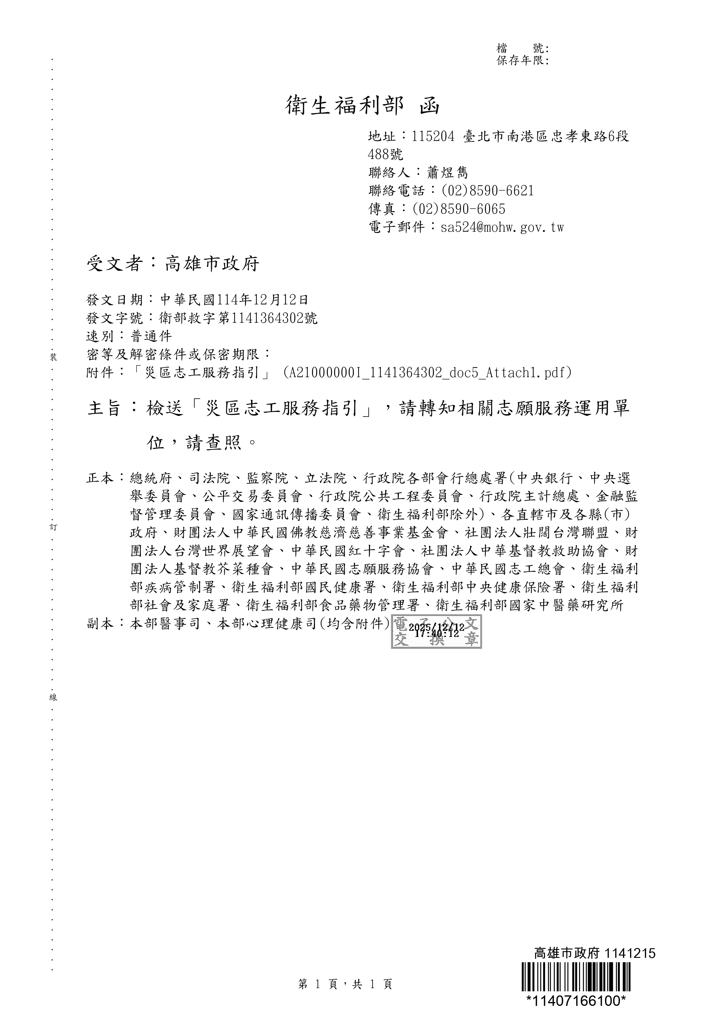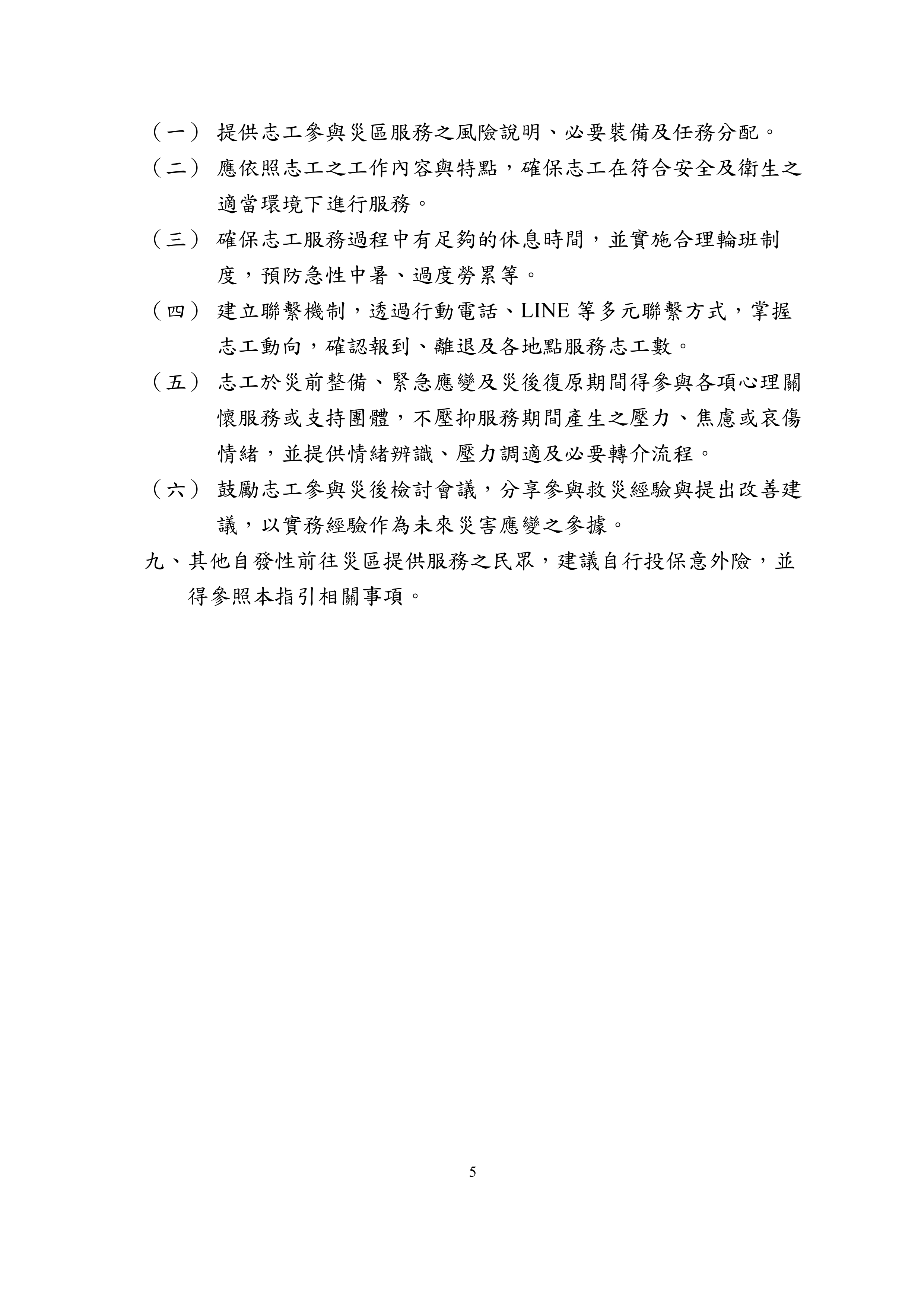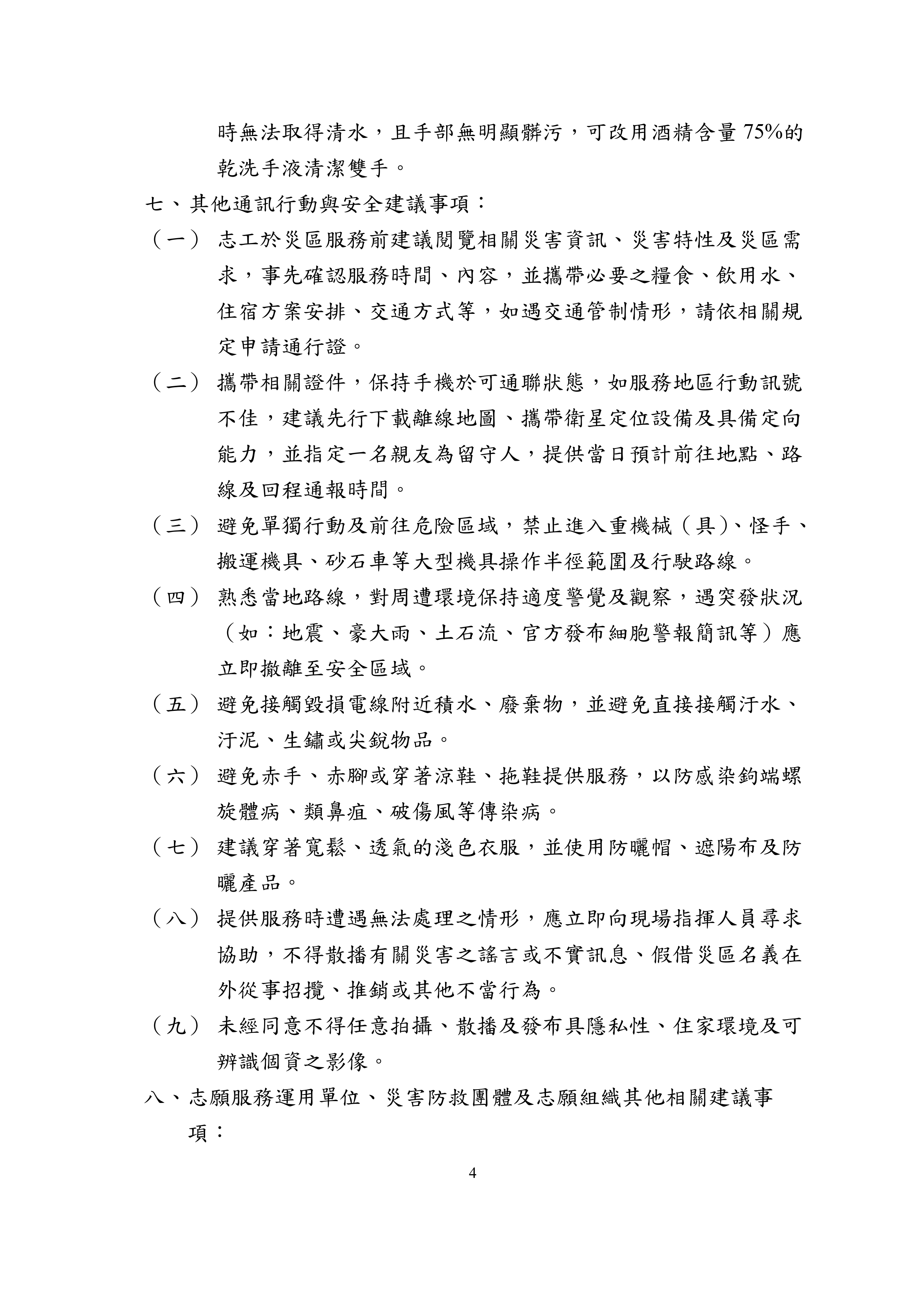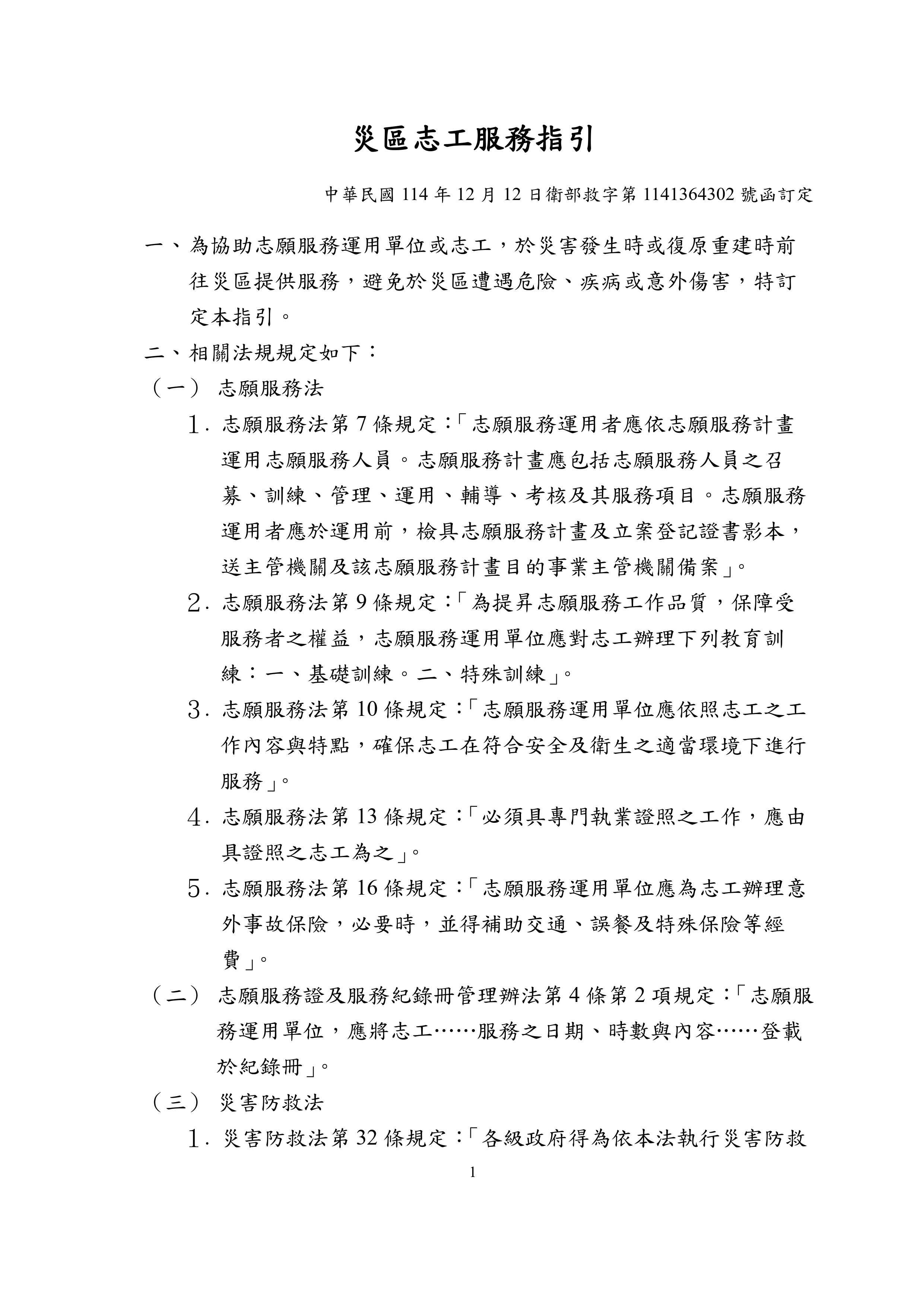 現在位置: 首頁 / 公告專區-中心訊息 / 轉知衛生福利部訂定之「災區志工服務指引」,供志願服務運用單位、志工,於災害發生或復原重建時前往災區提供服務時運用參考