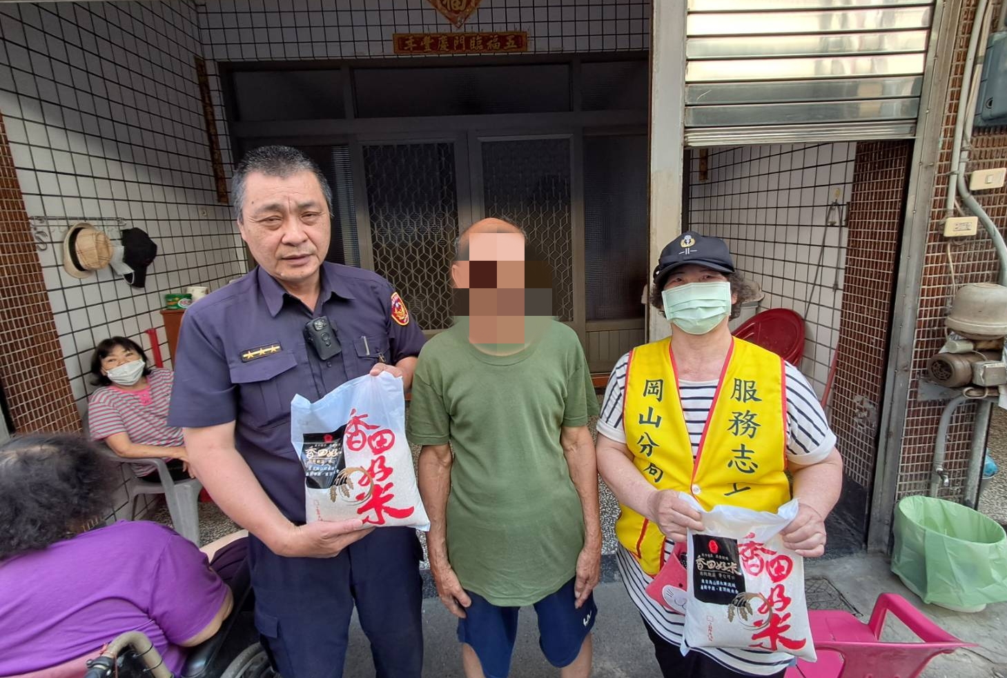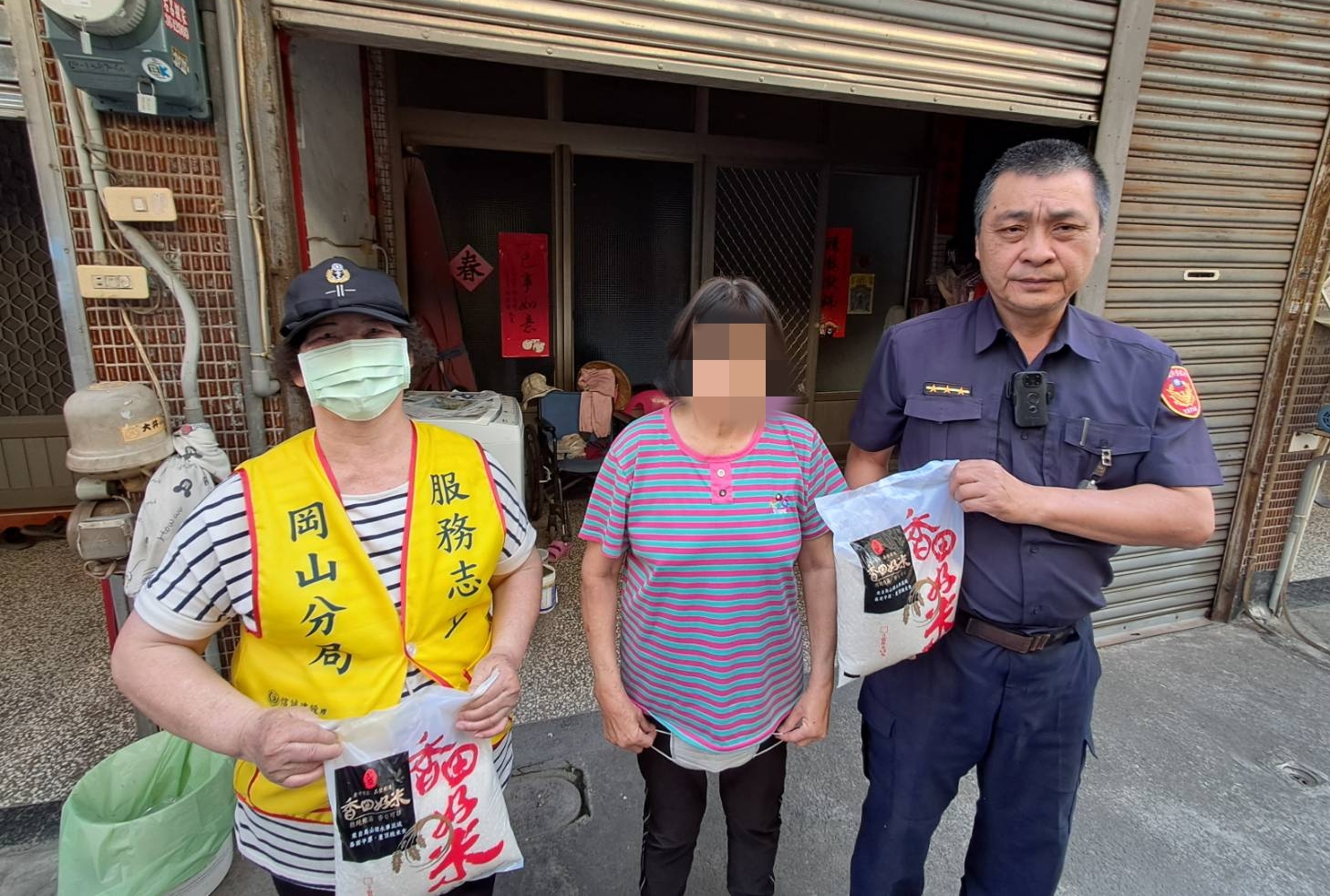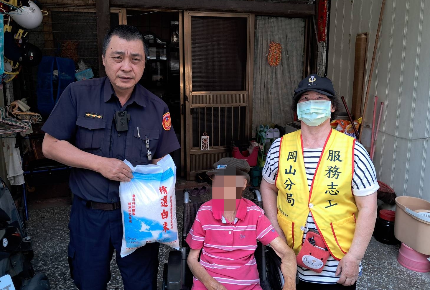 岡山分局員警偕同所內之志工媽媽,結合「張○忠」先生關懷弱勢家庭,主動提供白米等民生物資,由員警與志工一同親送至經濟困窘之家庭,表達關懷慰問之意,期能減輕渠等之生活上的重擔,並持續關懷聯繫,雖僅是微薄物資,透過此舉,讓受關懷者感受到社會的溫暖。