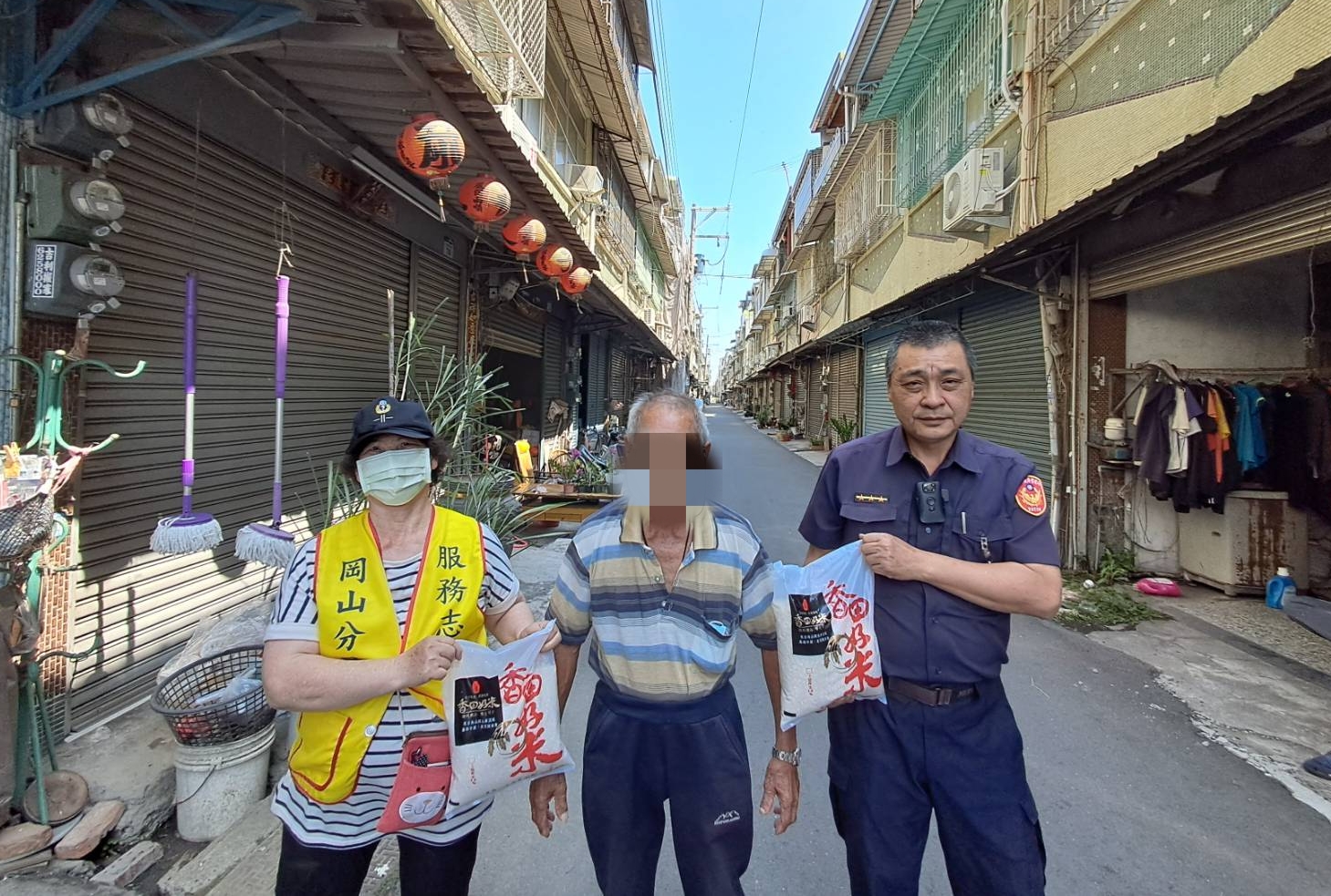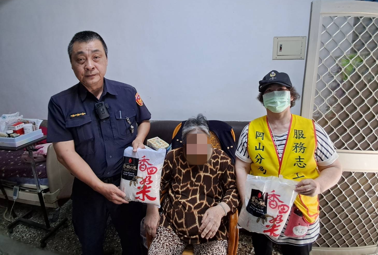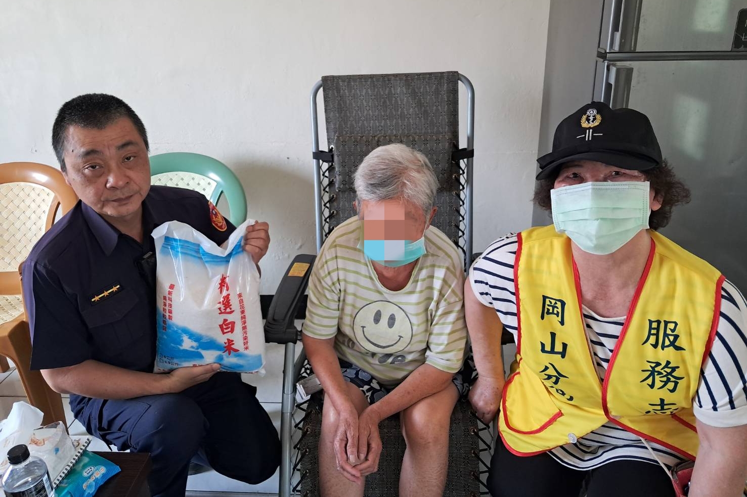 岡山分局員警偕同所內之志工媽媽,結合「張○忠」先生關懷弱勢家庭,主動提供白米等民生物資,由員警與志工一同親送至經濟困窘之家庭,表達關懷慰問之意,期能減輕渠等之生活上的重擔,並持續關懷聯繫,雖僅是微薄物資,透過此舉,讓受關懷者感受到社會的溫暖。
