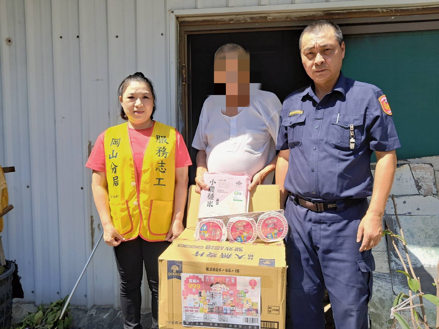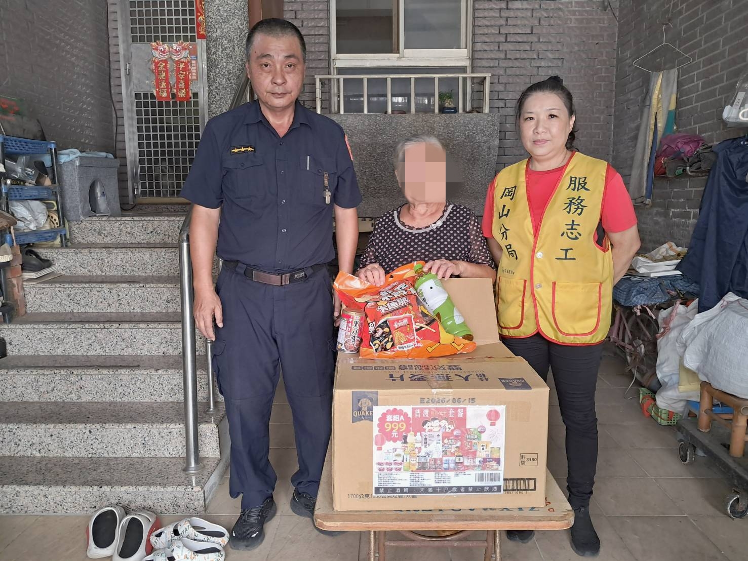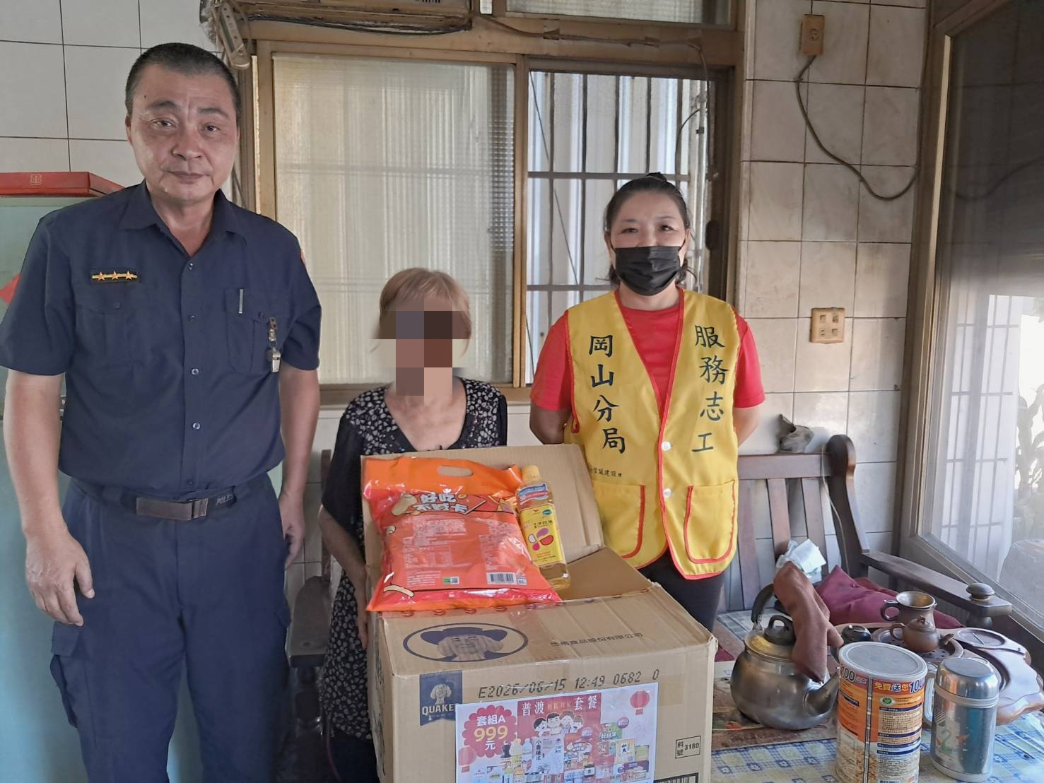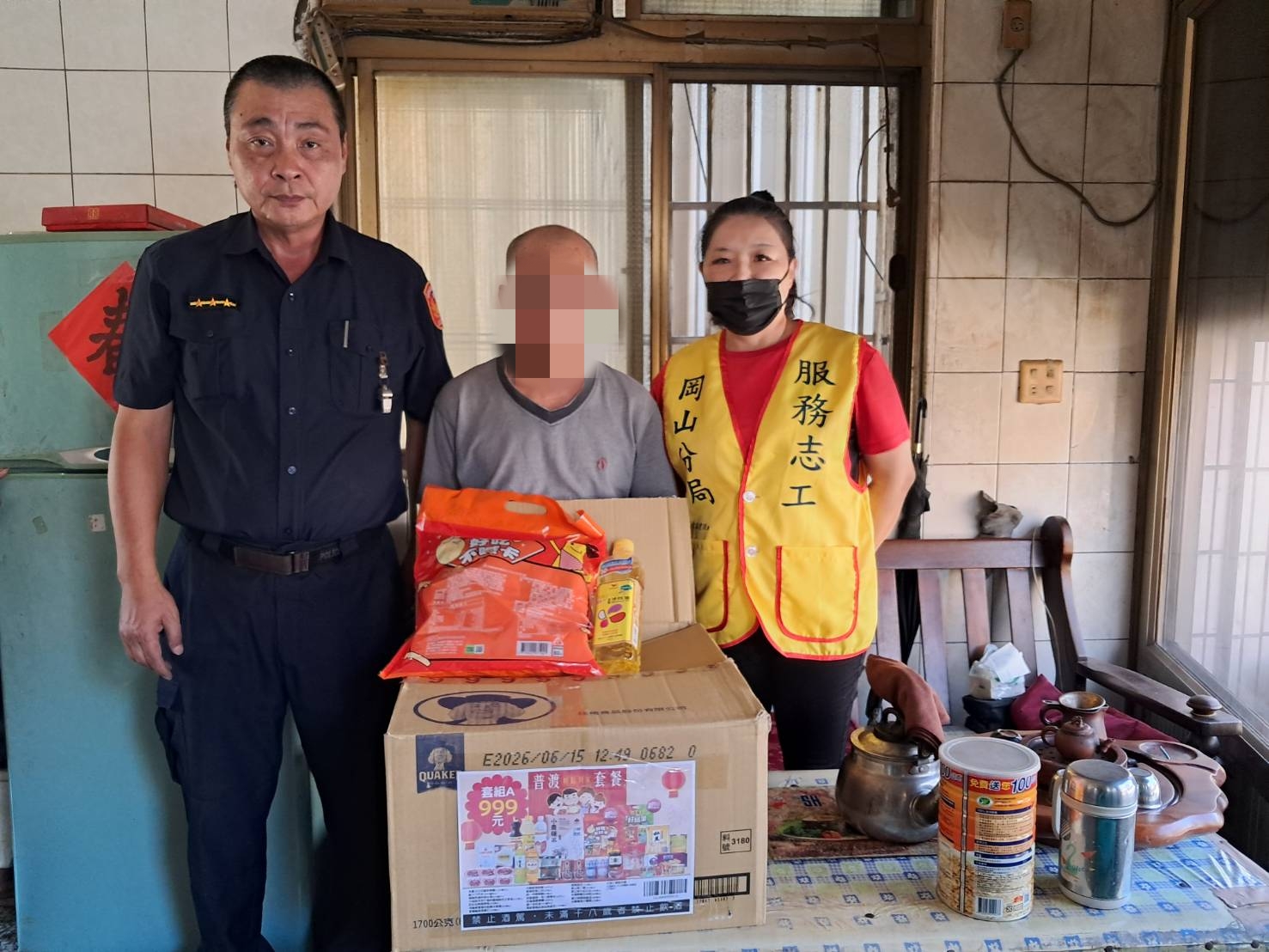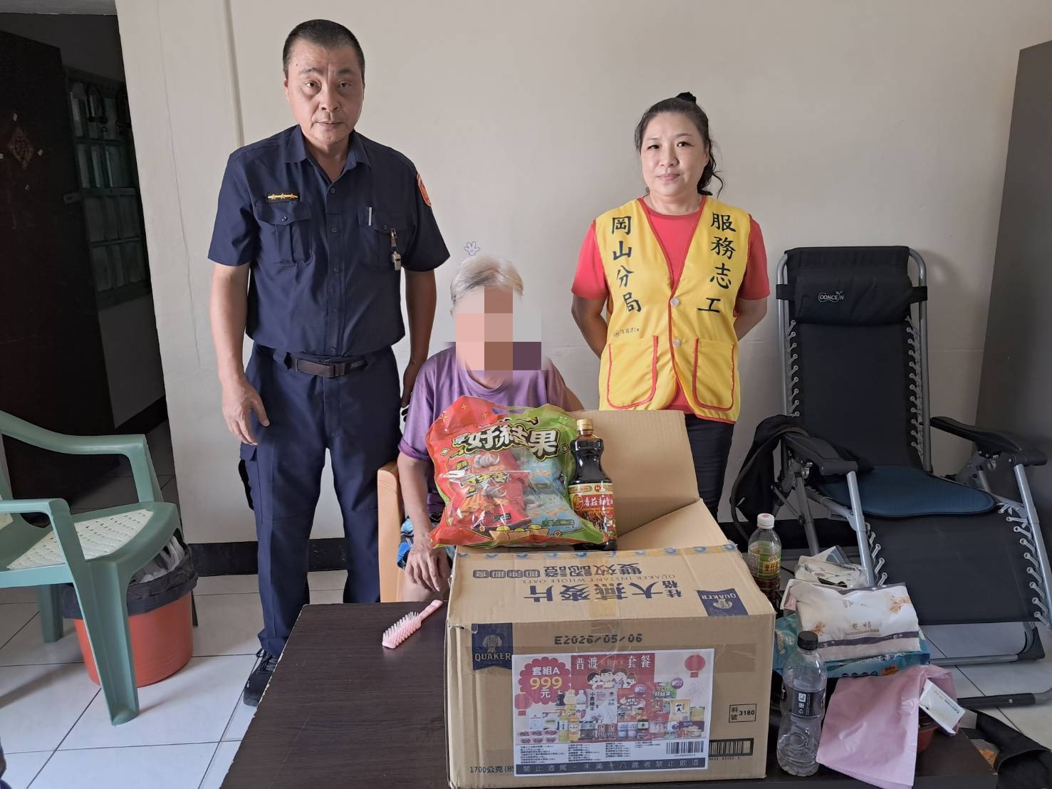 時值中元普渡節日,岡山分局梓官分駐所結合轄區內善心宮廟「仁興壇」關懷弱家庭,主動提供普渡套餐,內有『白米、麵、沙拉油、罐頭、餅乾等多項民生物資』,由員警偕同志工,親送至該經濟困窘戶中,表達關懷慰問之意,期能助渠舒緩經濟壓力。民眾對於員警與志工們基於愛心與關懷熱心幫助,深感謝意,深獲民眾嘉許。