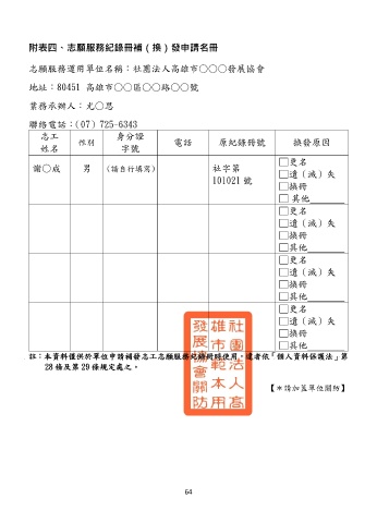註:本資料僅供於單位申請補發志工志願服務紀錄冊時使用,違者依「個人資料保護法」第
